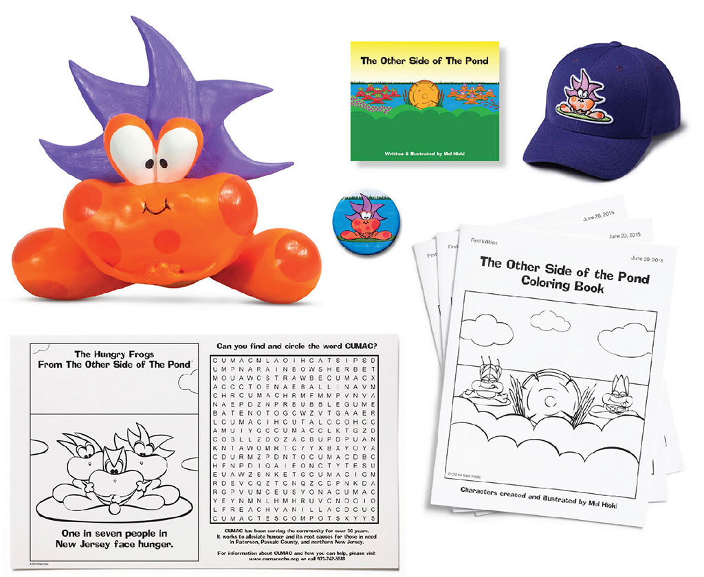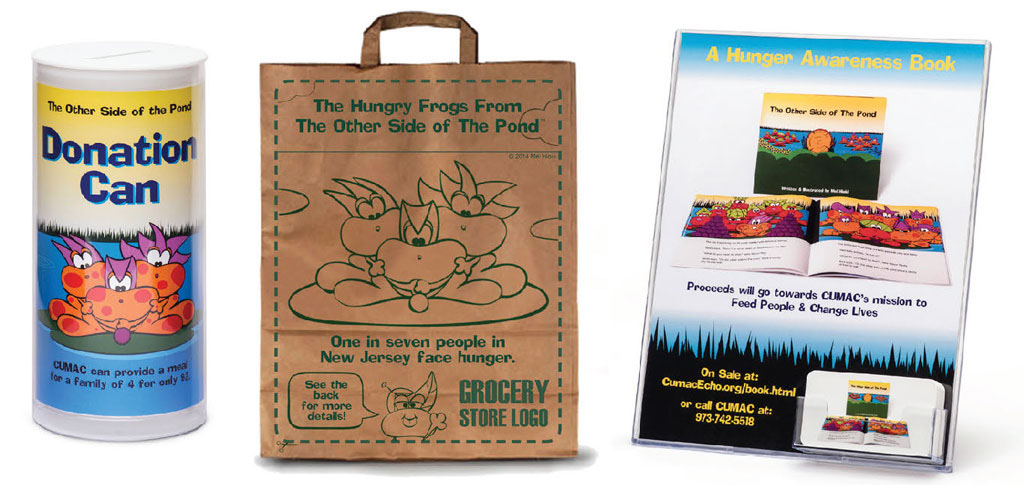 Sparky is from my first children’s book, The Other Side of The Pond, a hunger story to create awareness for children and adults. You can find a Food Drive template with hungry frog characters and tips on How to Host a Food Drive.